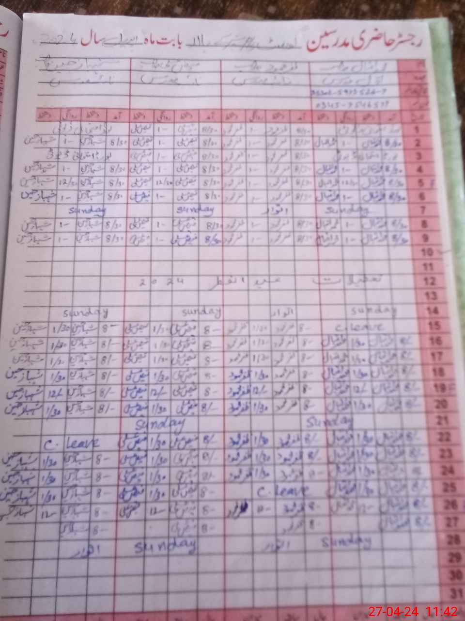 | CNIC | Full Name | Designation | R/C | Absence During Last Calender Month |