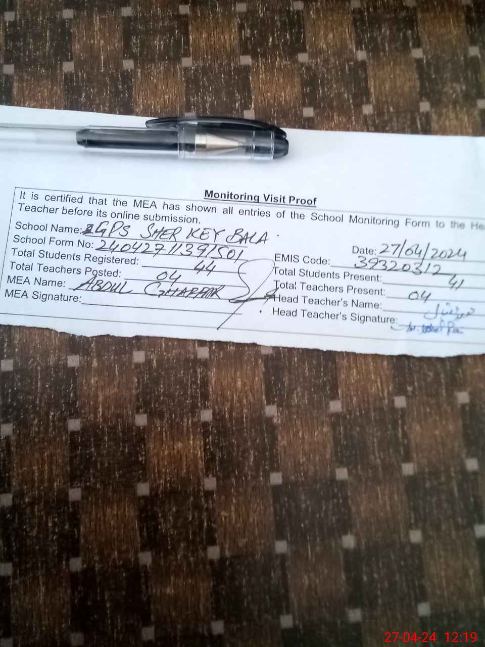 | Attendance Register | Head Teacher | MEA with School | Visit Proof |