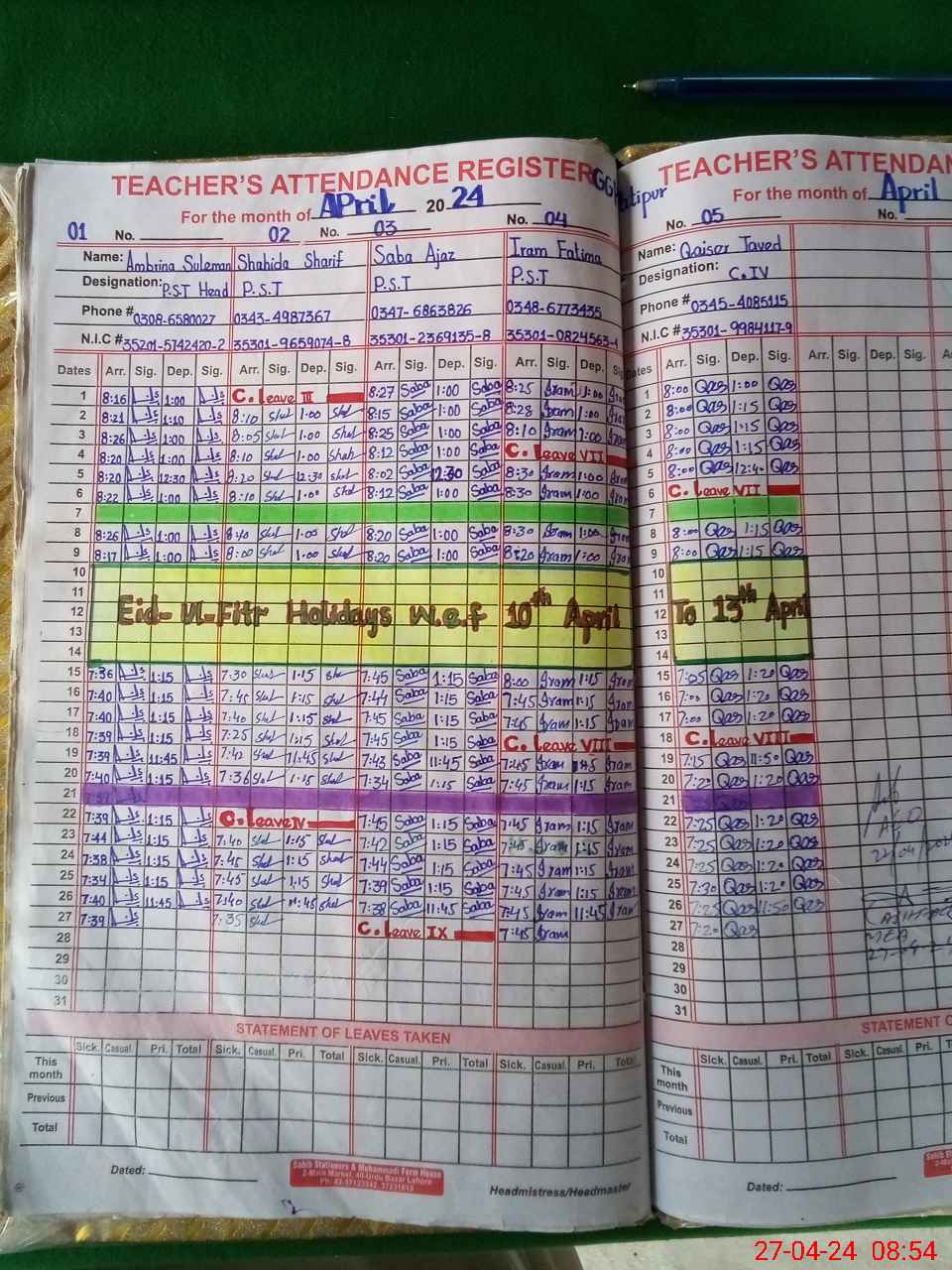 | CNIC | Full Name | Designation | R/C | Absence During Last Calender Month |