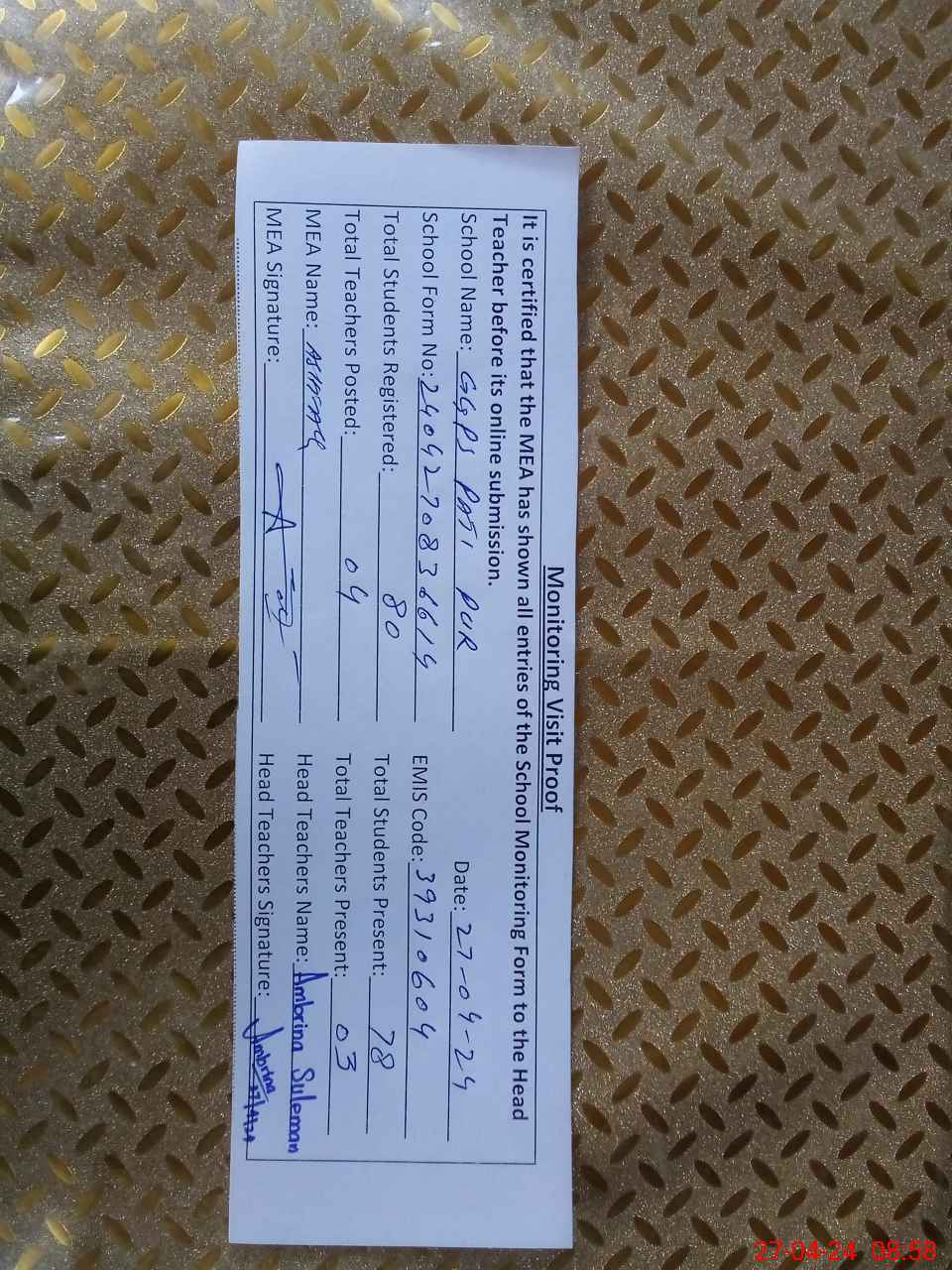 | Attendance Register | Head Teacher | MEA with School | Visit Proof |