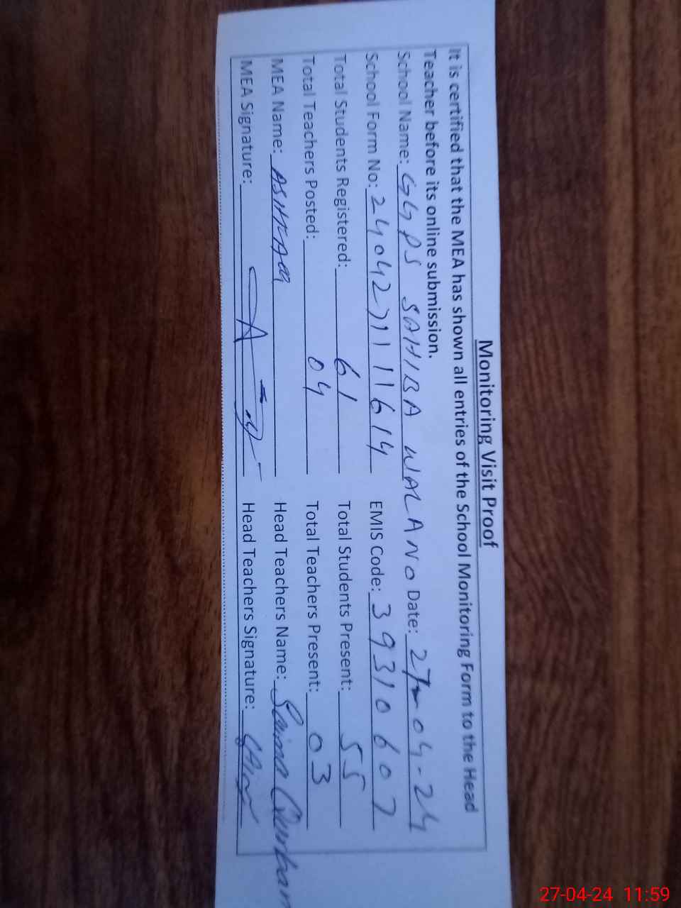 | Attendance Register | Head Teacher | MEA with School | Visit Proof |