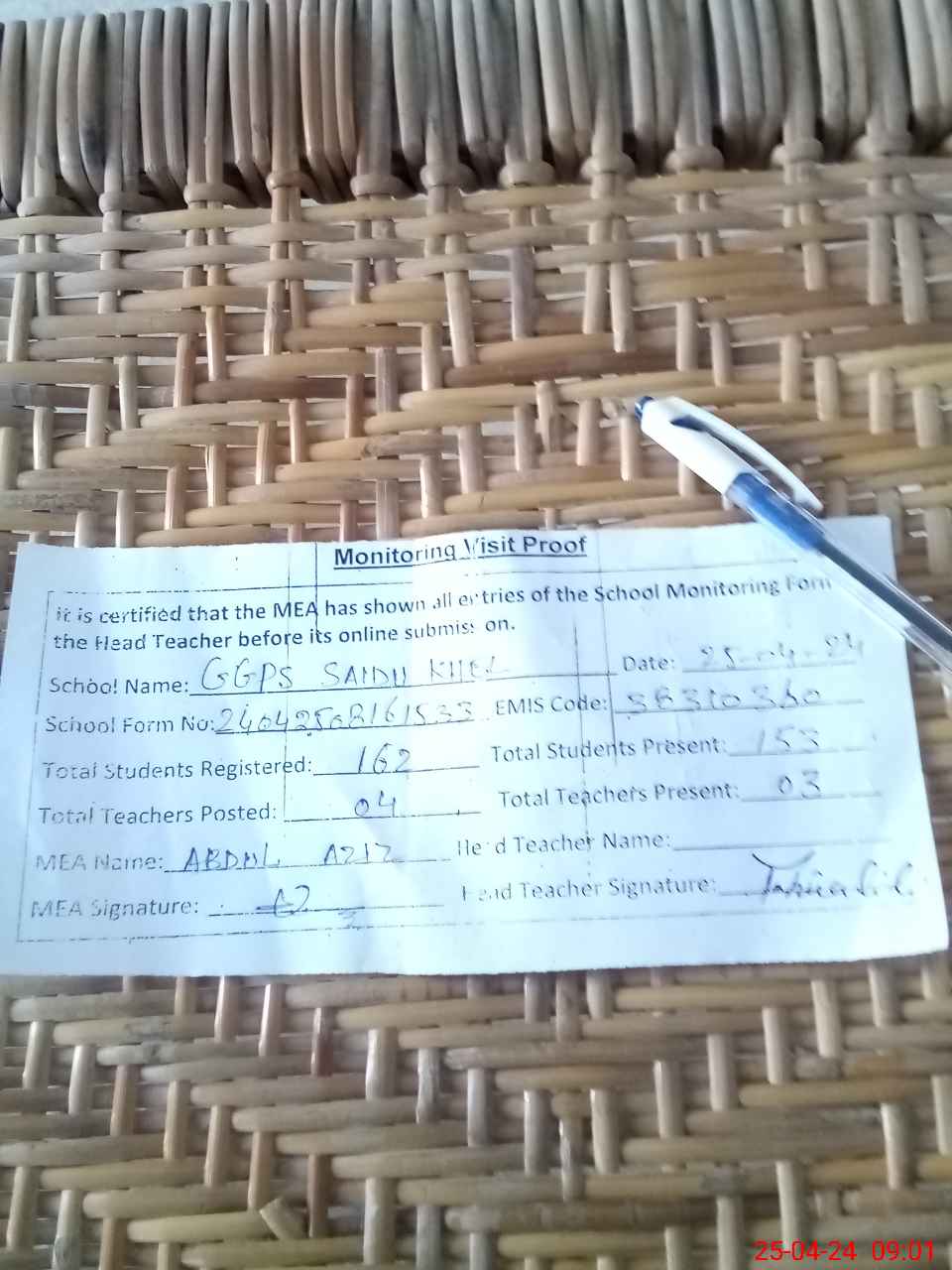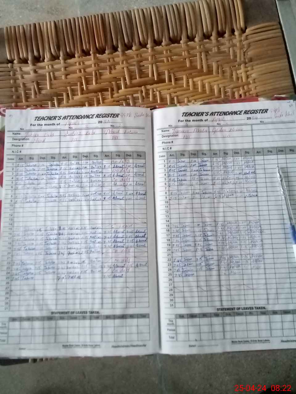 | Total no. of Classrooms: 4 No. of Classrooms Used for Teaching: 4 No. of Classrooms Storing Old Furniture, FTBs, etc: 0Comments if Any: PST IMTIAZ BIBI is physical absent but her attendance on register is written at 0745 hrs whereas she arrived at 08160 |