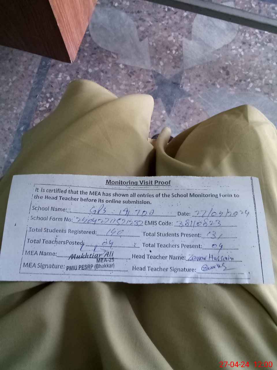 | Attendance Register | Head Teacher | MEA with School | Visit Proof |