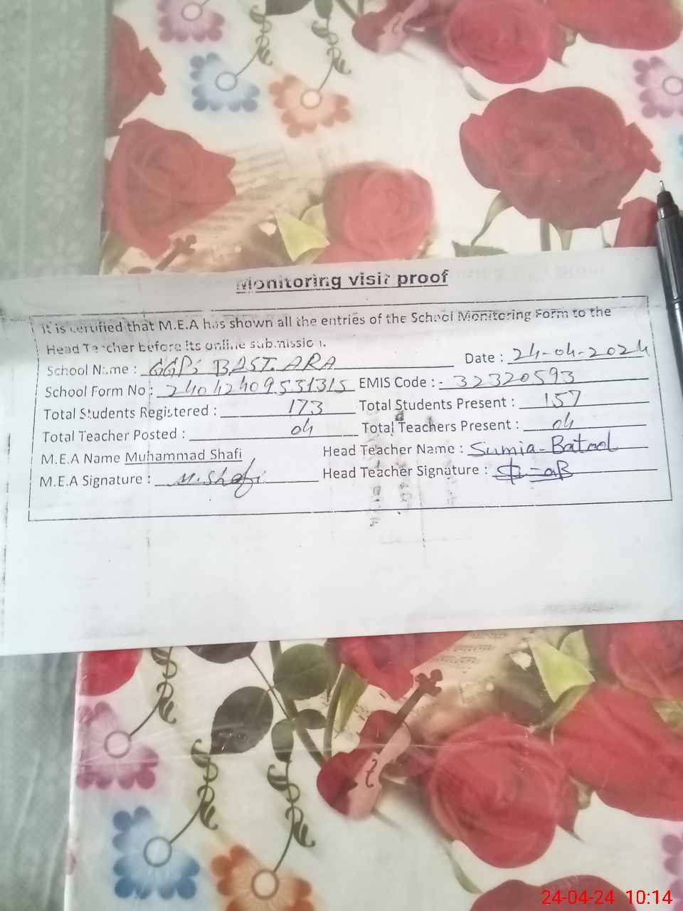 | Attendance Register | Head Teacher | MEA with School | Visit Proof |