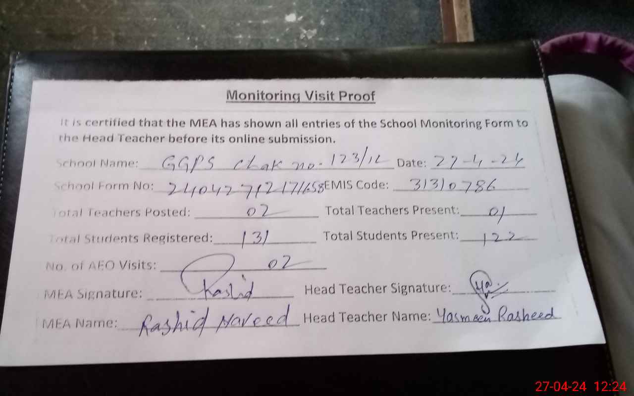 | EMIS Code: 31310786 | Name of School: GGPS CHAK NO. 123/1-L | |||