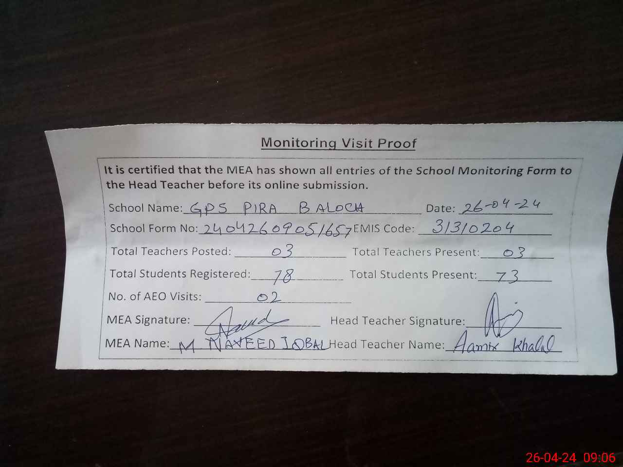 | Attendance Register | Head Teacher | MEA with School | Visit Proof |