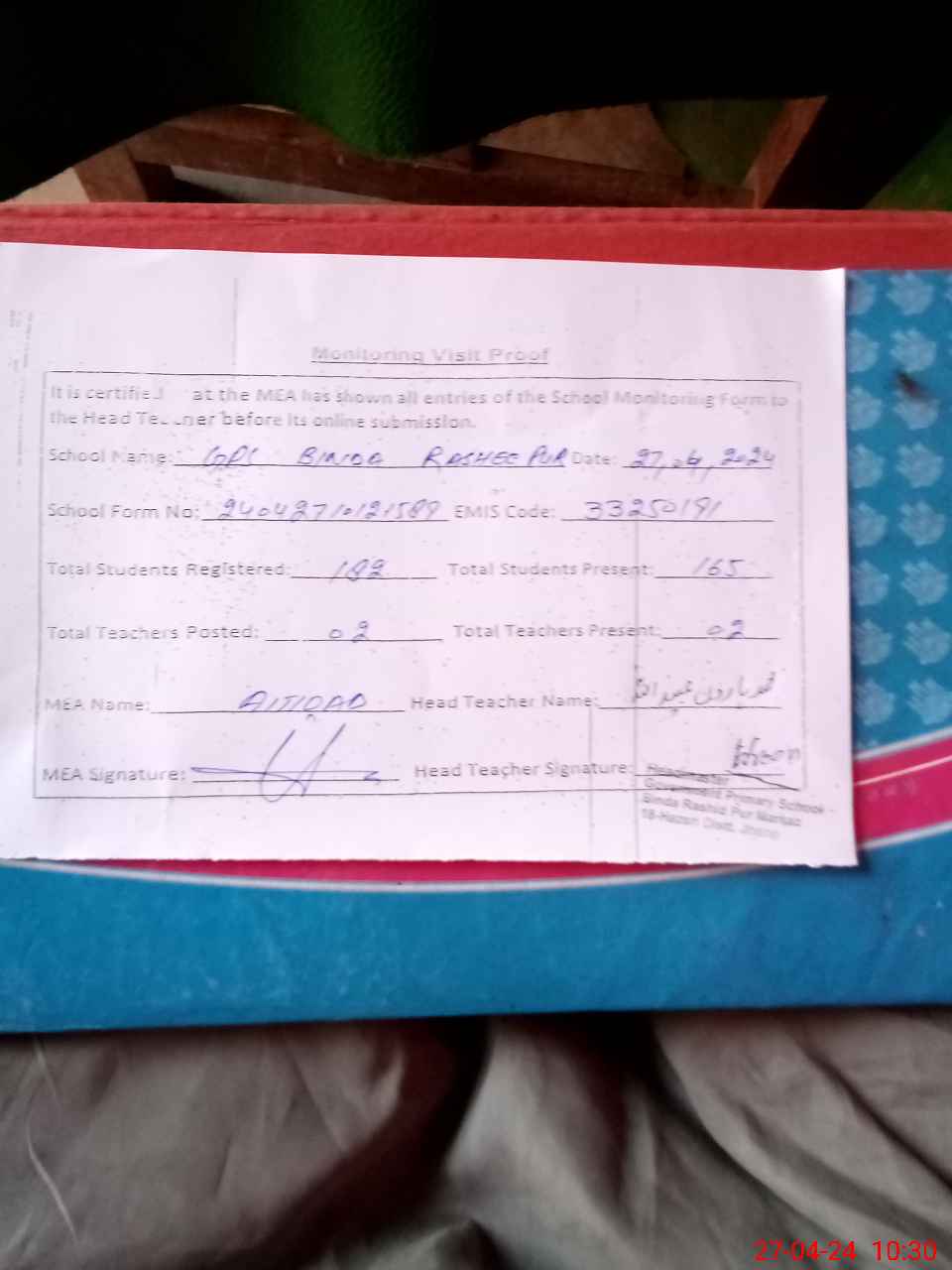 | Attendance Register | Head Teacher | MEA with School | Visit Proof |