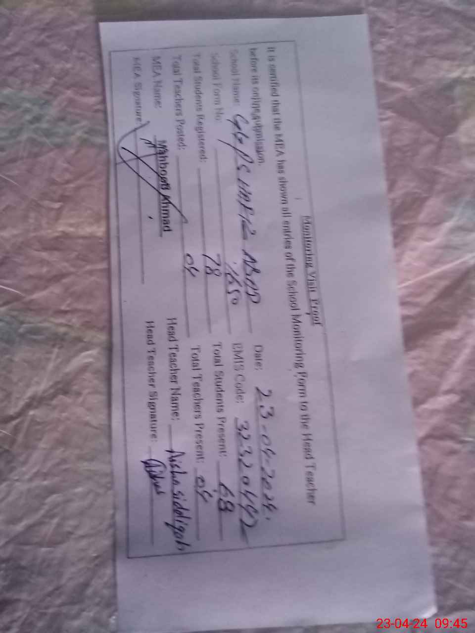 | Attendance Register | Head Teacher | MEA with School | Visit Proof |