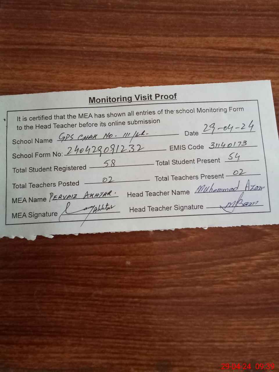 | EMIS Code: 31140173 | Name of School: GPS CHAK NO 111/6-R | |||