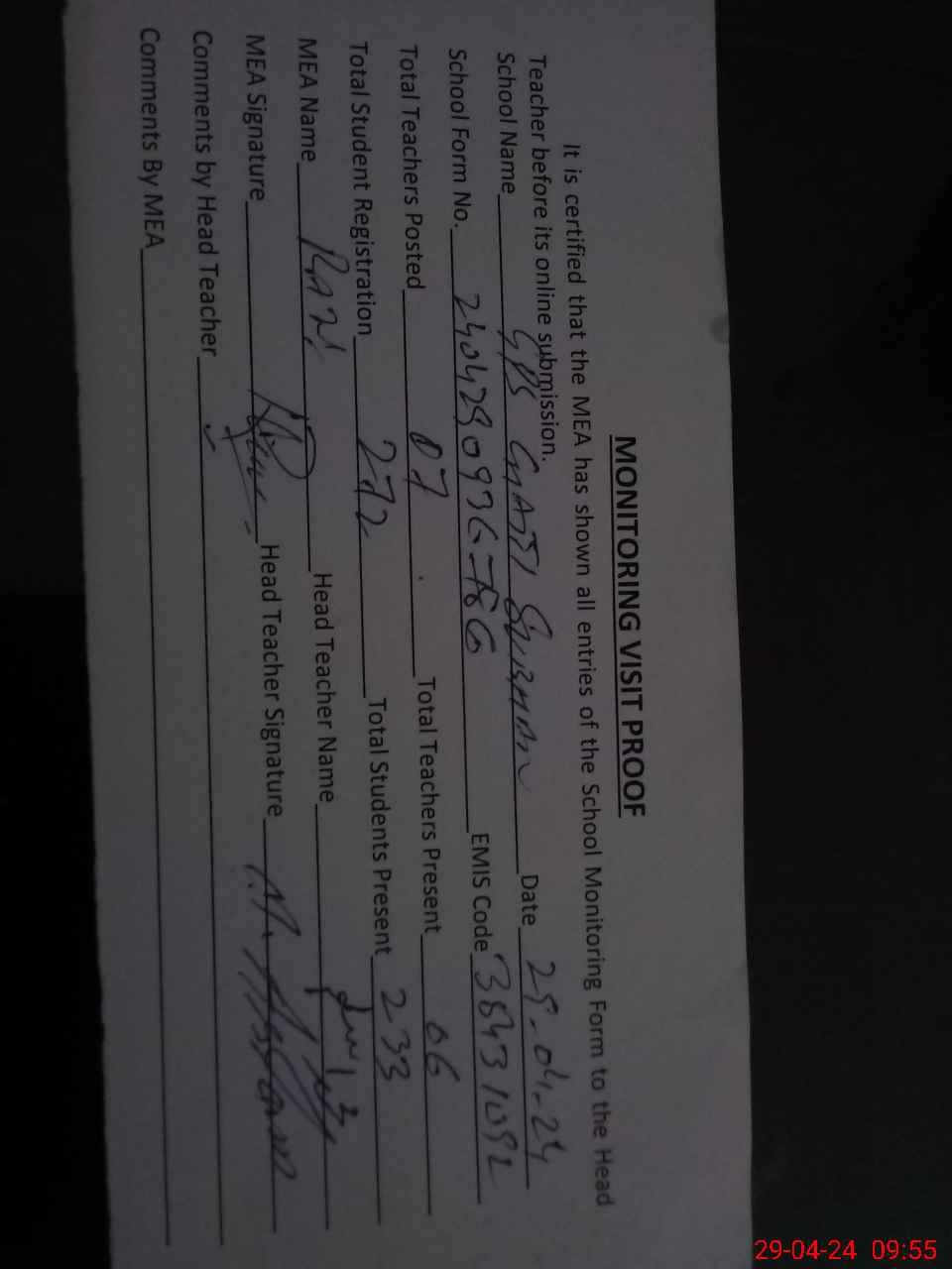 | Attendance Register | Head Teacher | MEA with School | Visit Proof |