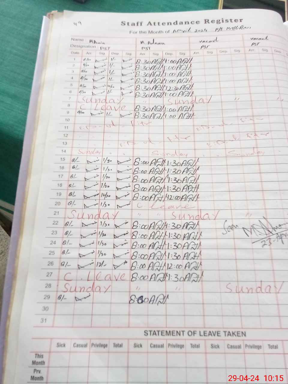 | CNIC | Full Name | Designation | R/C | Absence During Last Calender Month |
