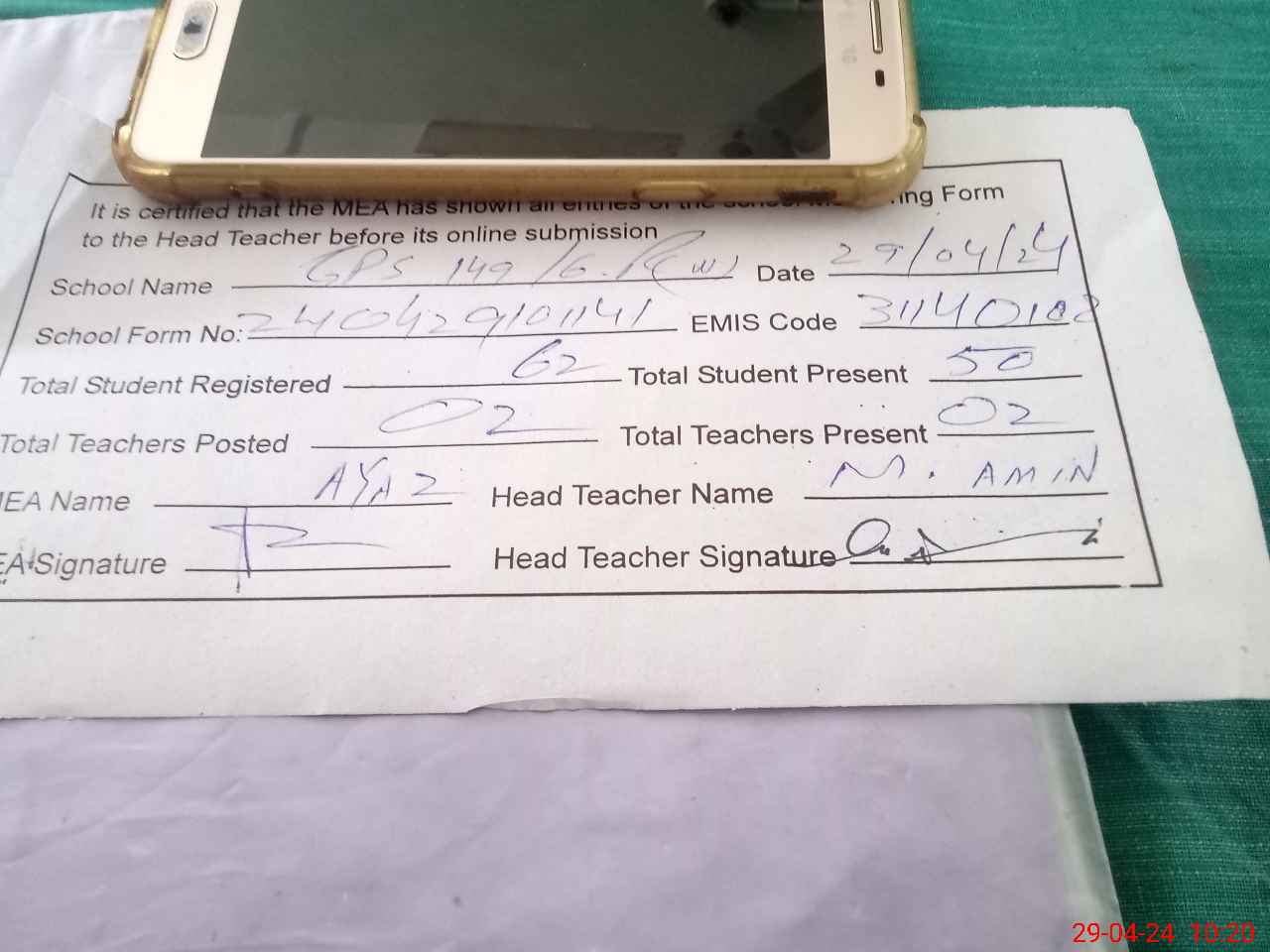 | Attendance Register | Head Teacher | MEA with School | Visit Proof |
