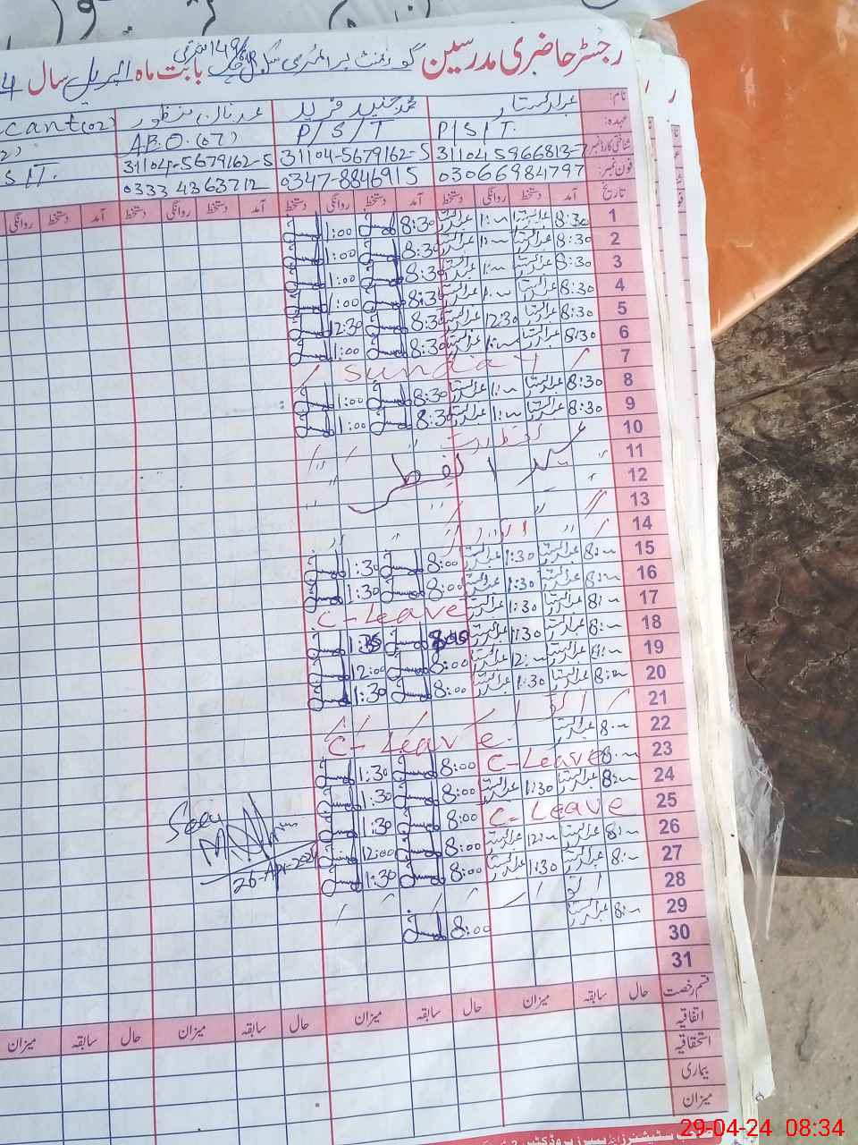 | CNIC | Full Name | Designation | R/C | Absence During Last Calender Month |