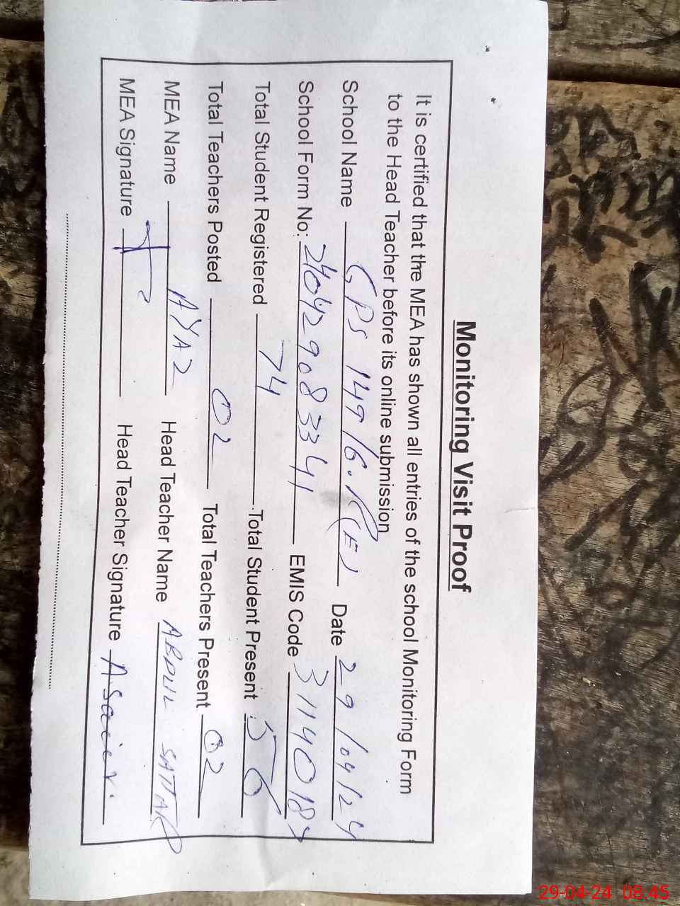 | Attendance Register | Head Teacher | MEA with School | Visit Proof |