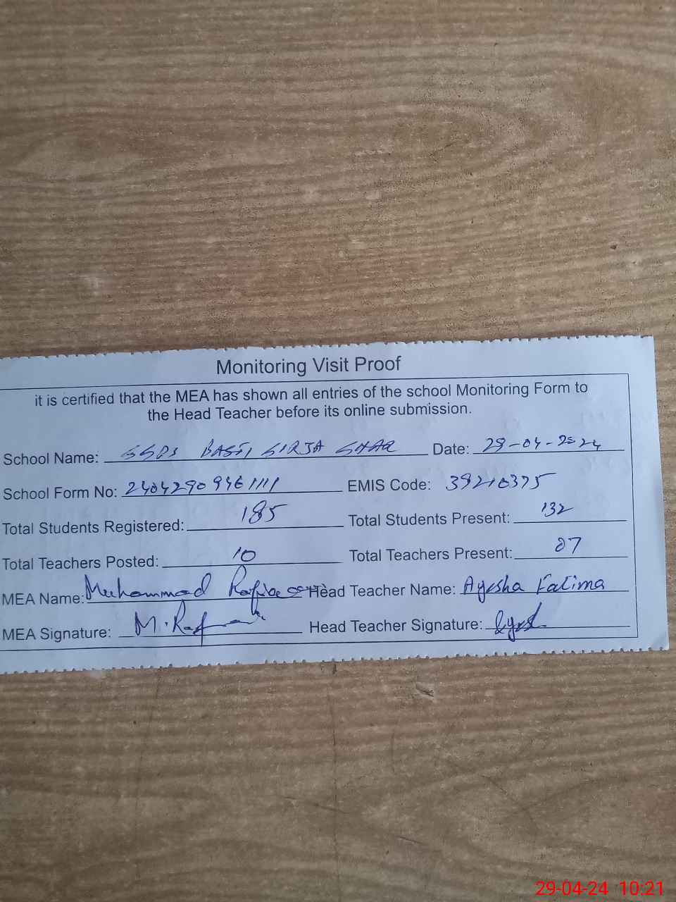 | Certified that this School was Inspected by the Undersigned MEA/DMO Today and the Information Stated Above is as Per Record. | |||||