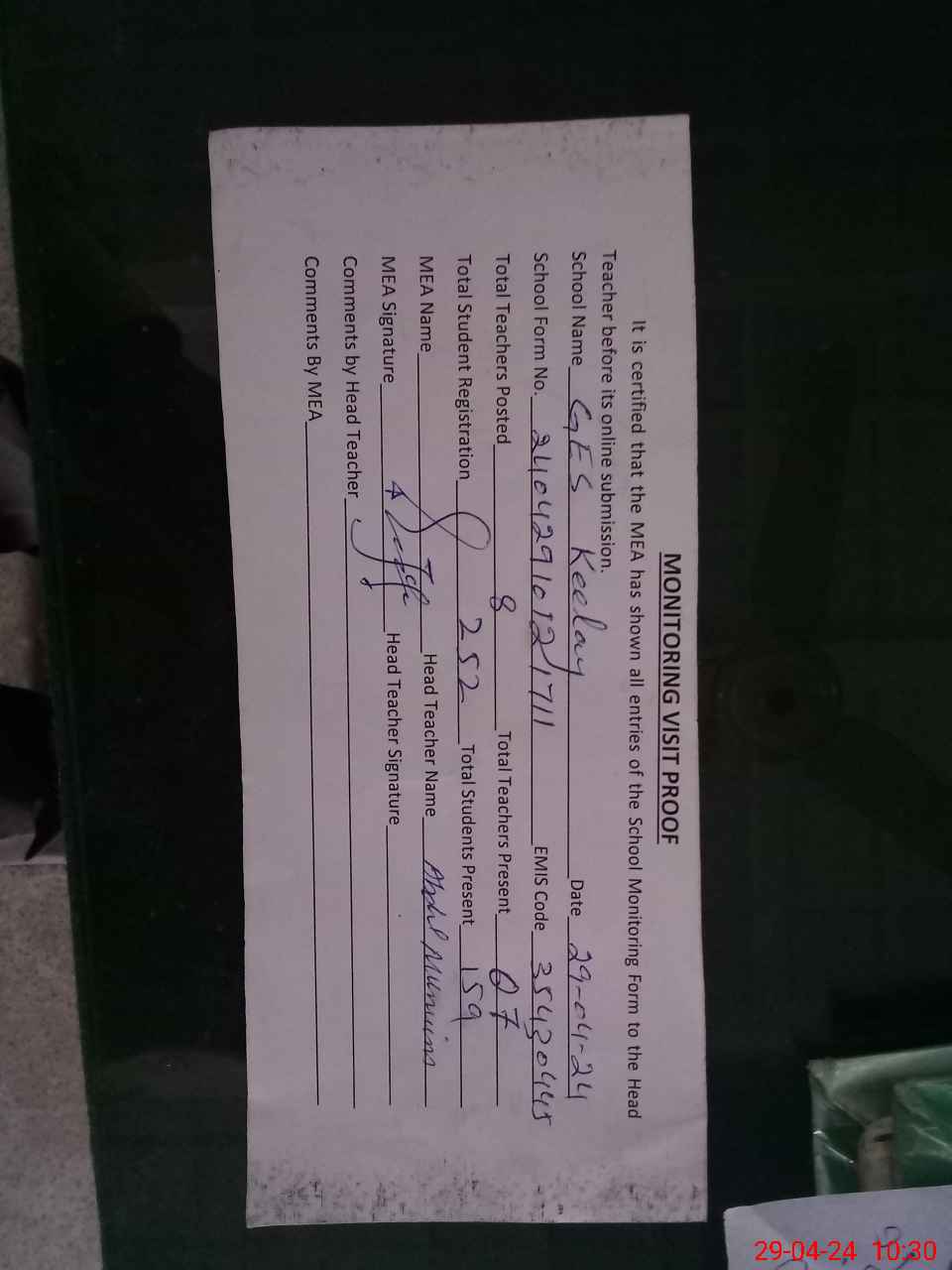 | Attendance Register | Head Teacher | MEA with School | Visit Proof |