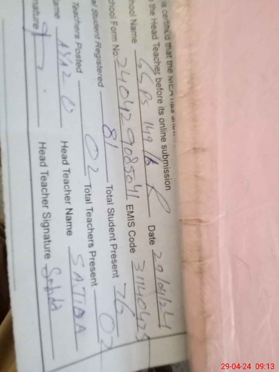 | Name: SA**** NA**** Designation: (School Headmaster's/Headmistress's) PTC/JV Phone/Cell Number: 03**** |