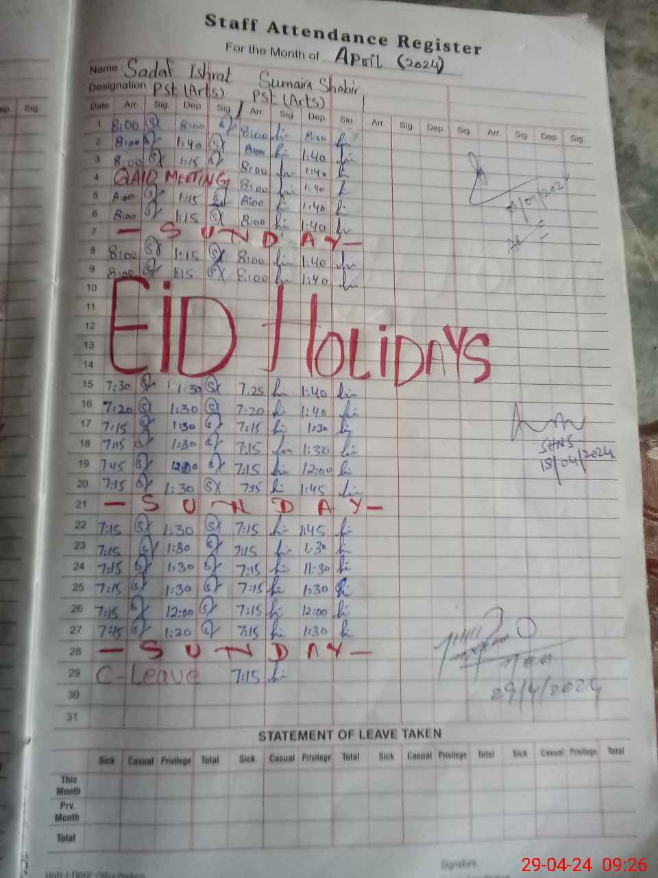 | Leave | Duty | Absent | Maternity | Medical | Ex- Pak |