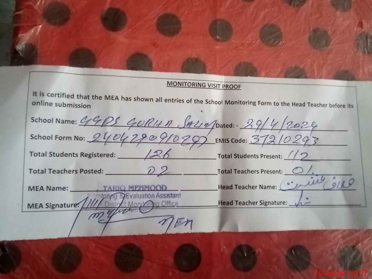 | Attendance Register | Head Teacher | MEA with School | Visit Proof |
