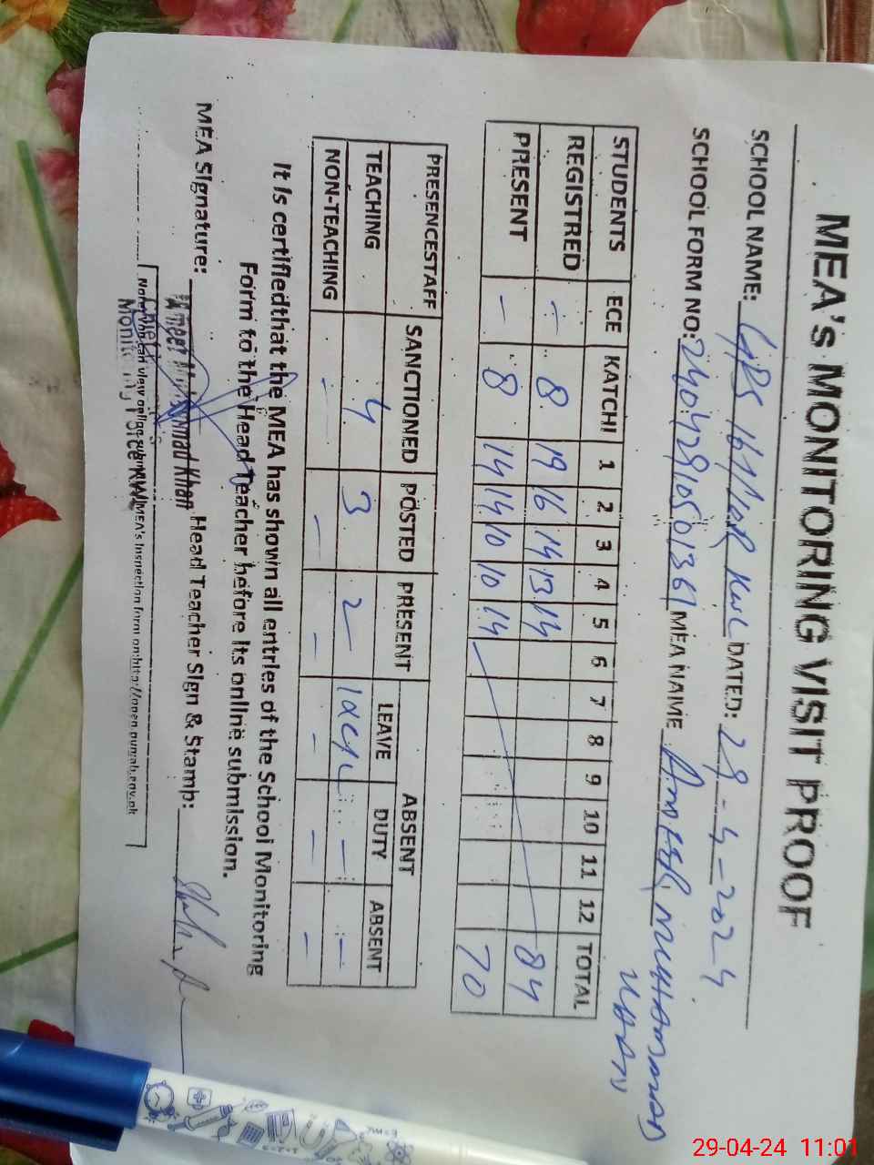 | Attendance Register | Head Teacher | MEA with School | Visit Proof |