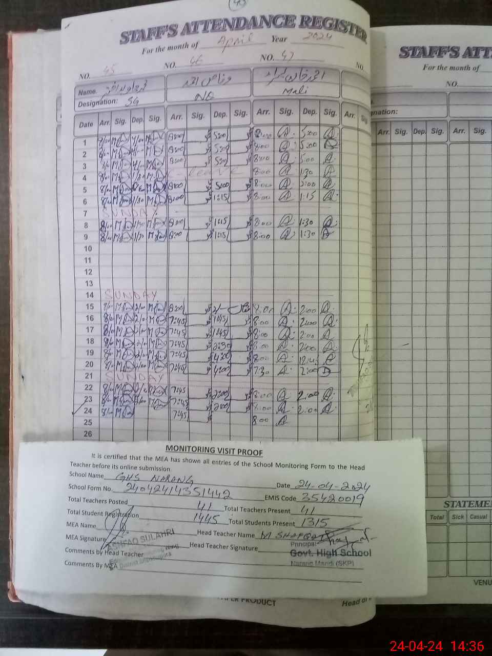 | Attendance Register | Head Teacher | MEA with School | Visit Proof |