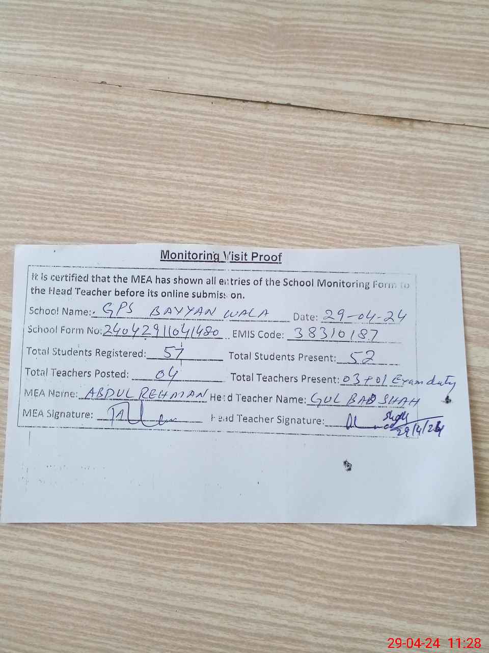 | EMIS Code: 38310187 | Name of School: GPS BAYYAN WALA | |||