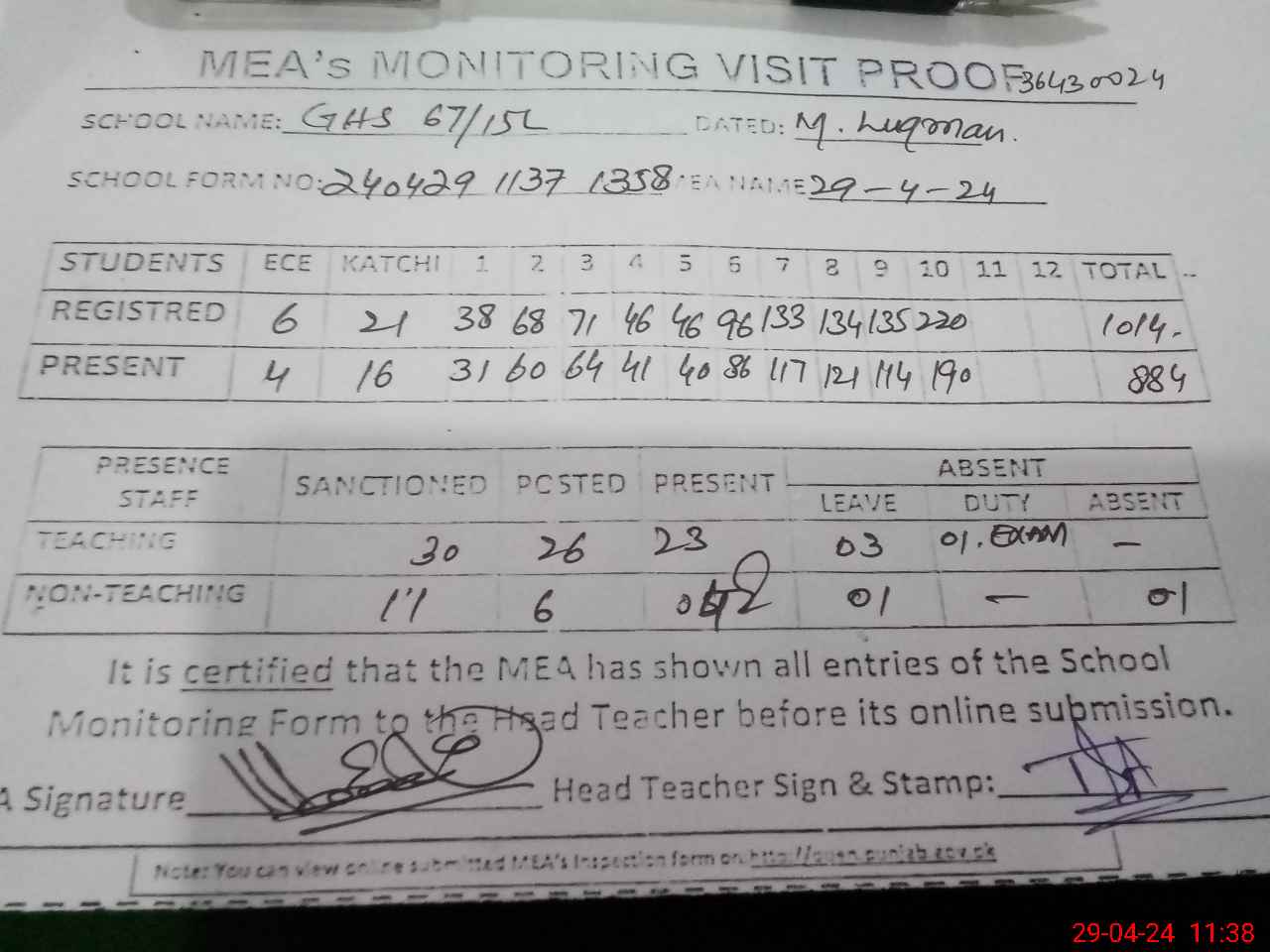 | EMIS Code: 36430024 | Name of School: GHS 67/15-L, MIAN CHANNU | |||
