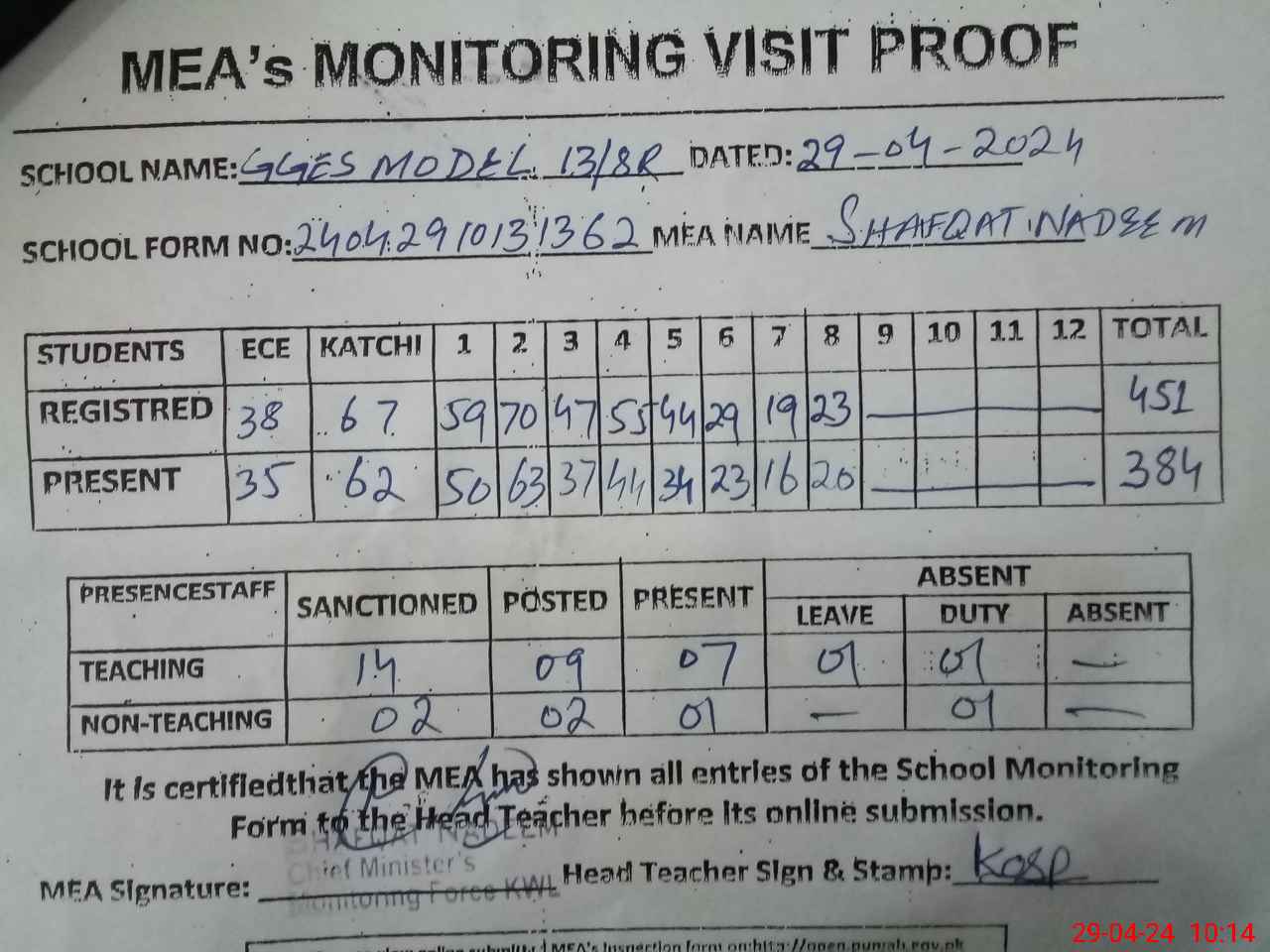 | Attendance Register | Head Teacher | MEA with School | Visit Proof |