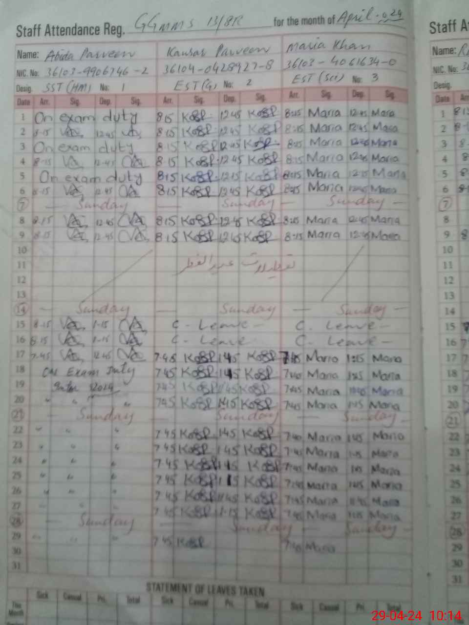 | 36**** | Ab**** Pe**** | 5 | 1 | 0 | 0 | 0 | 0 | 0 | 0 | 0 | 0 | 0 | Exam Duty |