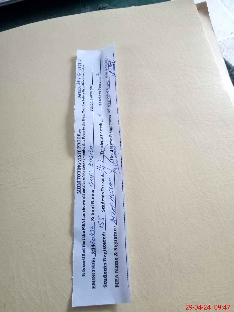 | Attendance Register | Head Teacher | MEA with School | Visit Proof |