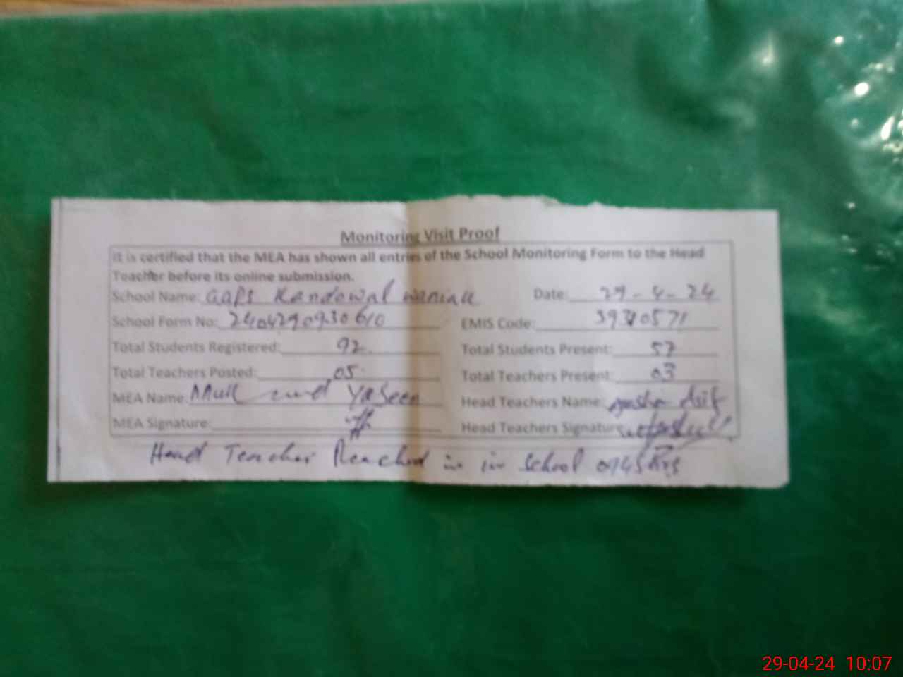 | Attendance Register | Head Teacher | MEA with School | Visit Proof |