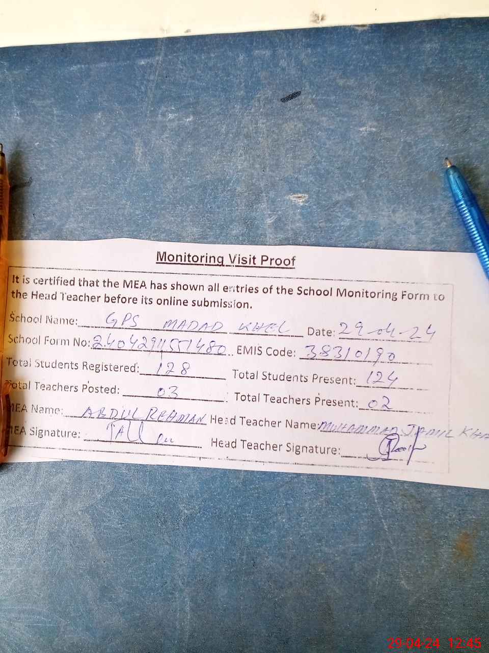 | Attendance Register | Head Teacher | MEA with School | Visit Proof |