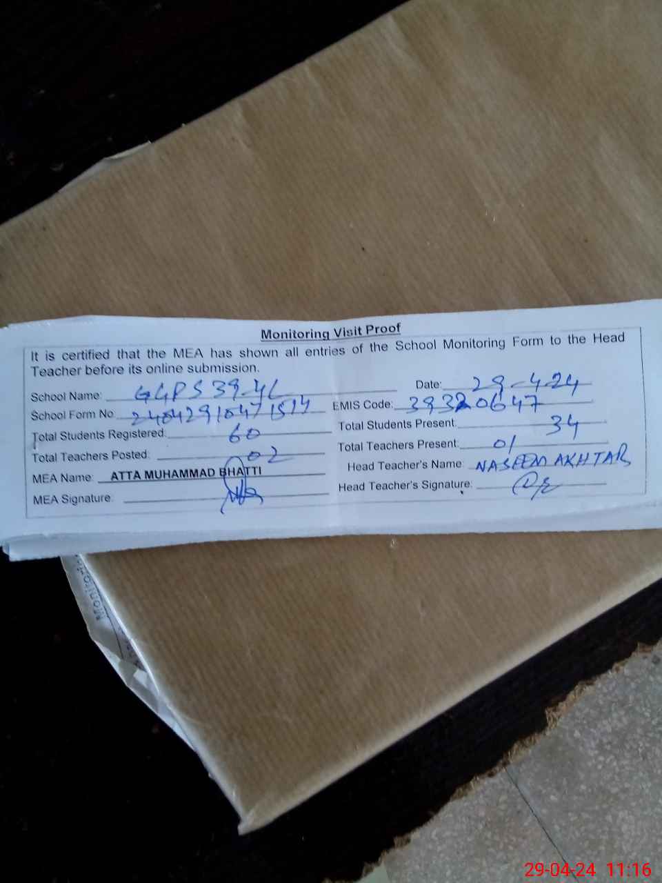 | EMIS Code: 39320647 | Name of School: GGPS CHAK NO. 39/4-L | |||