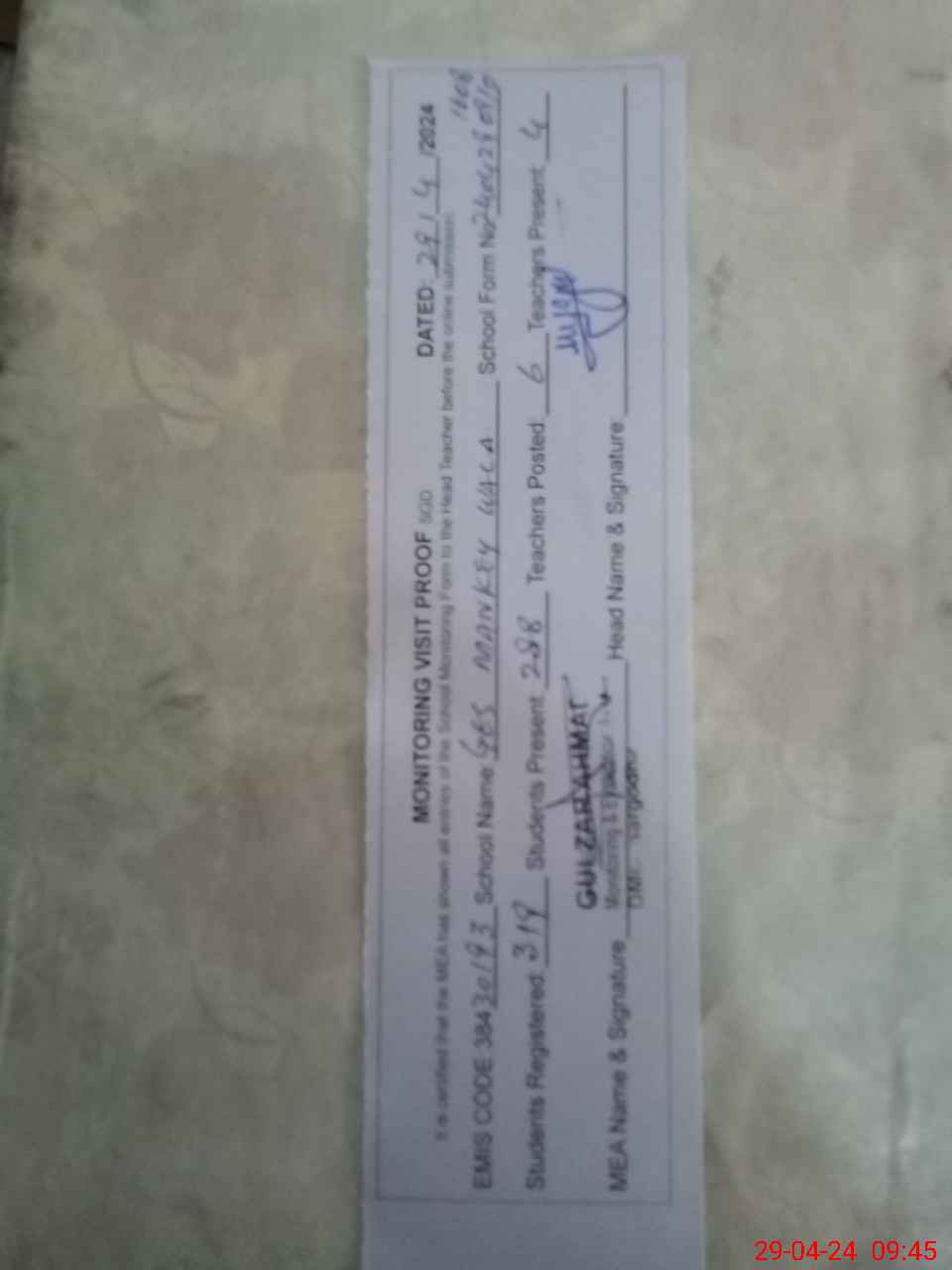 | Attendance Register | Head Teacher | MEA with School | Visit Proof |