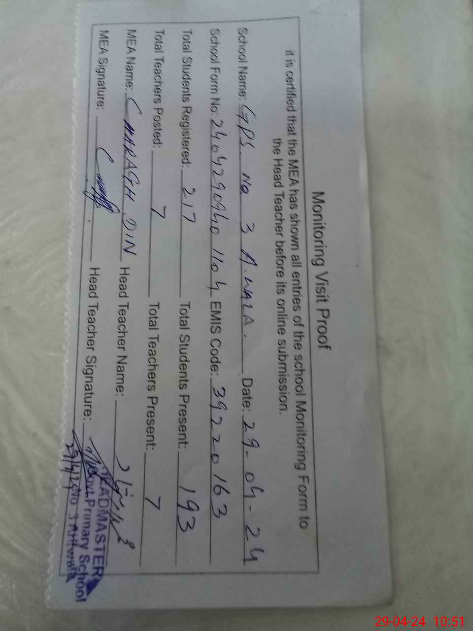 | Attendance Register | Head Teacher | MEA with School | Visit Proof |