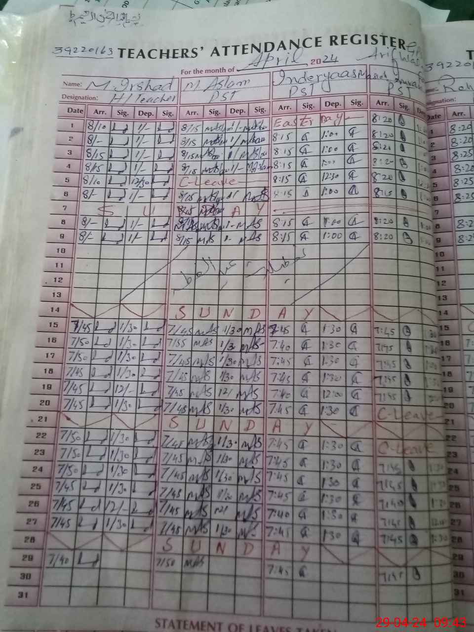 | CNIC | Full Name | Designation | R/C | Absence During Last Calender Month |