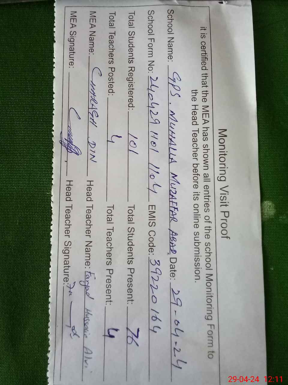 | EMIS Code: 39220164 | Name of School: GPS MOHALA MUZAFFAR ABAD | |||