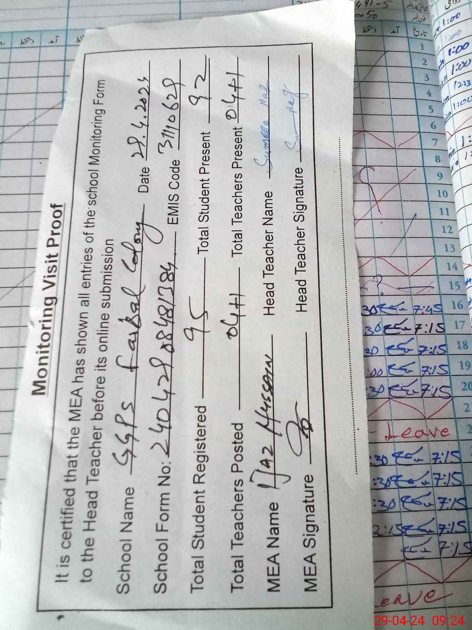 | Attendance Register | Head Teacher | MEA with School | Visit Proof |