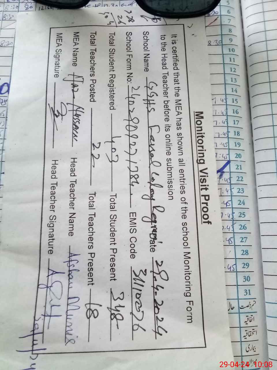 | Attendance Register | Head Teacher | MEA with School | Visit Proof |