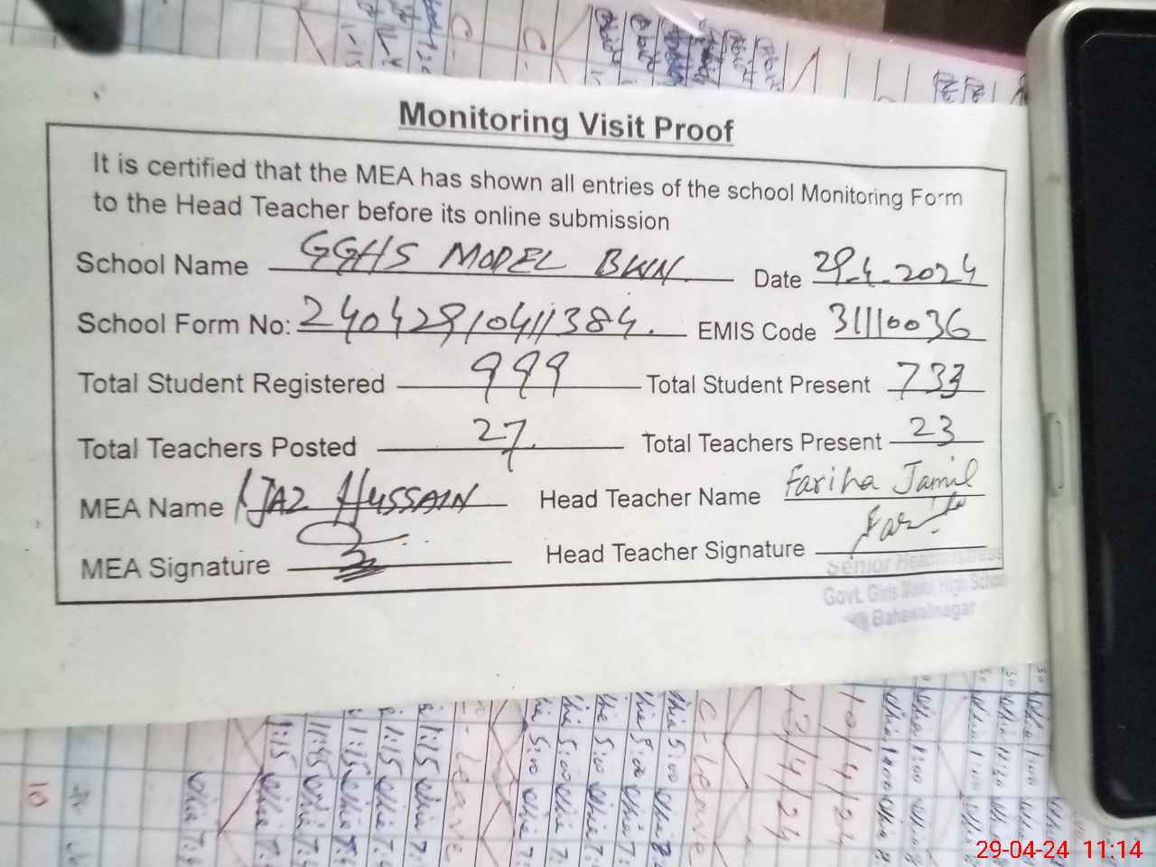 | Attendance Register | Head Teacher | MEA with School | Visit Proof |