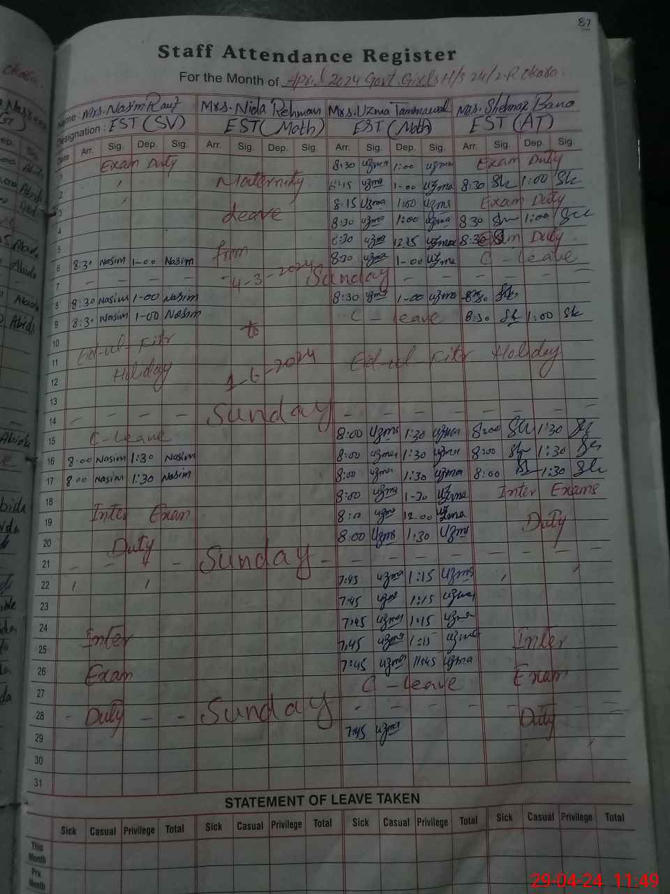 | 34**** | Sh**** Ba**** | 3 | 1 | 0 | 0 | 0 | 0 | 0 | 0 | 0 | 0 | 0 | Exam Duty |