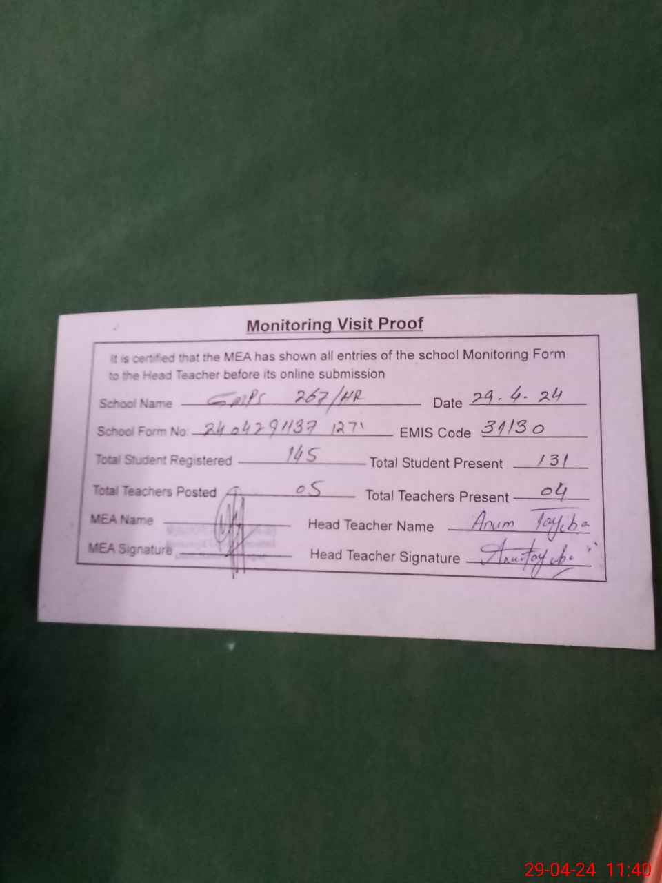 | Attendance Register | Head Teacher | MEA with School | Visit Proof |