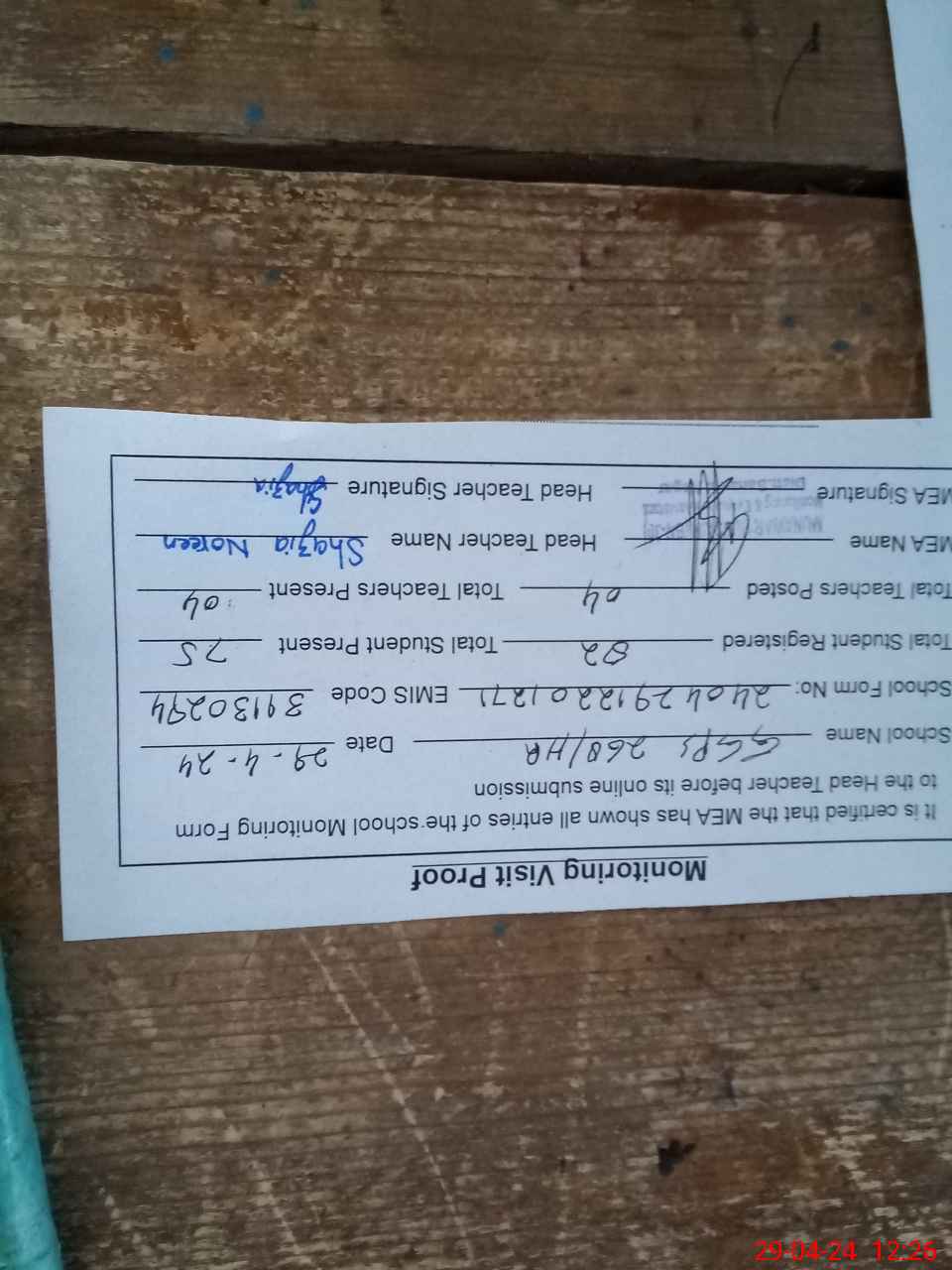| Attendance Register | Head Teacher | MEA with School | Visit Proof |