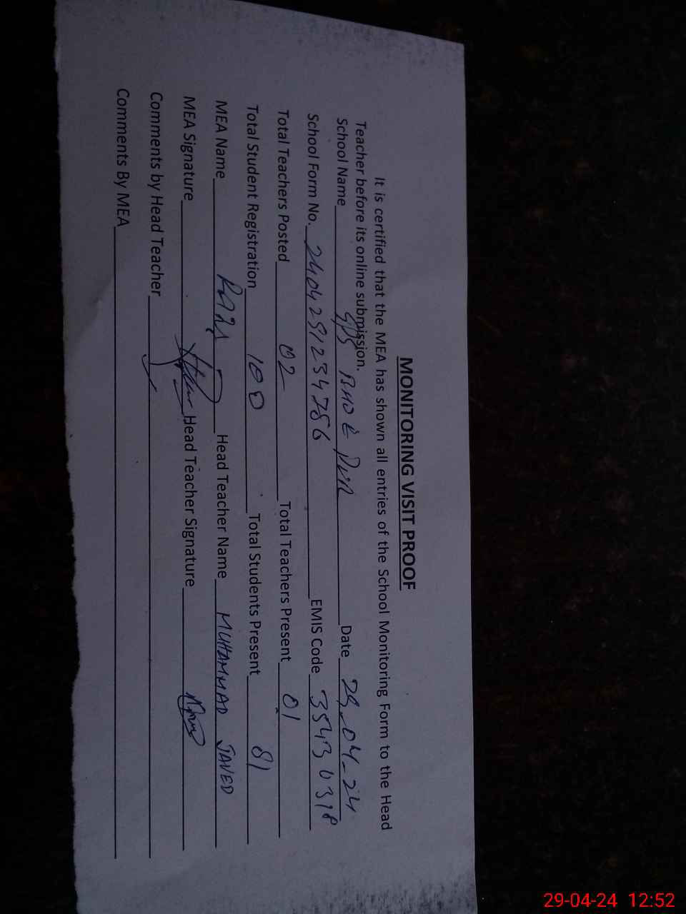 | Attendance Register | Head Teacher | MEA with School | Visit Proof |