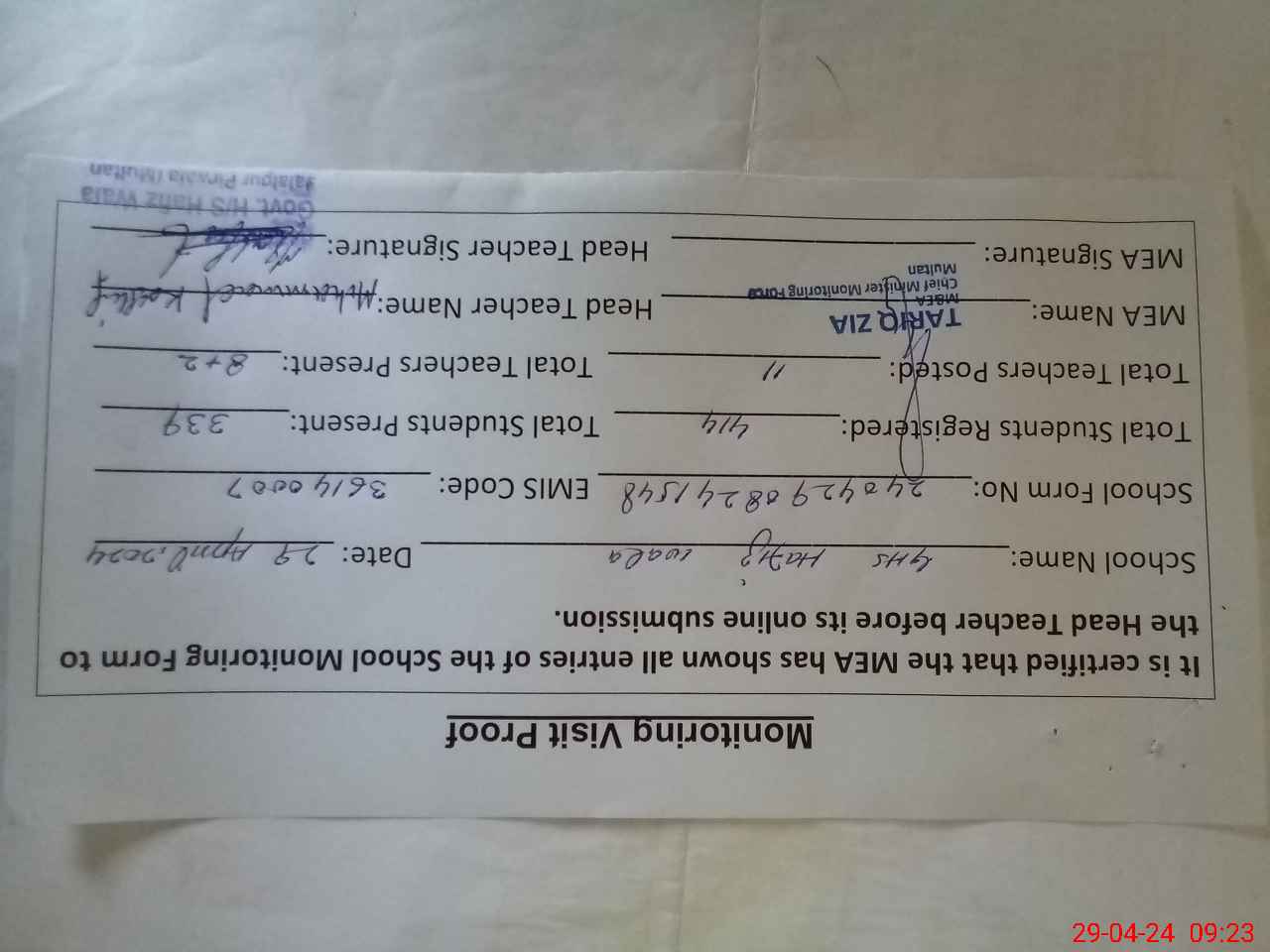 | Certified that this School was Inspected by the Undersigned MEA/DMO Today and the Information Stated Above is as Per Record. | |||||