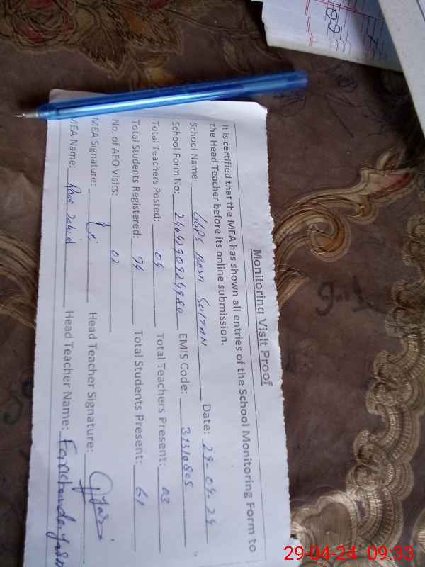 | Attendance Register | Head Teacher | MEA with School | Visit Proof |