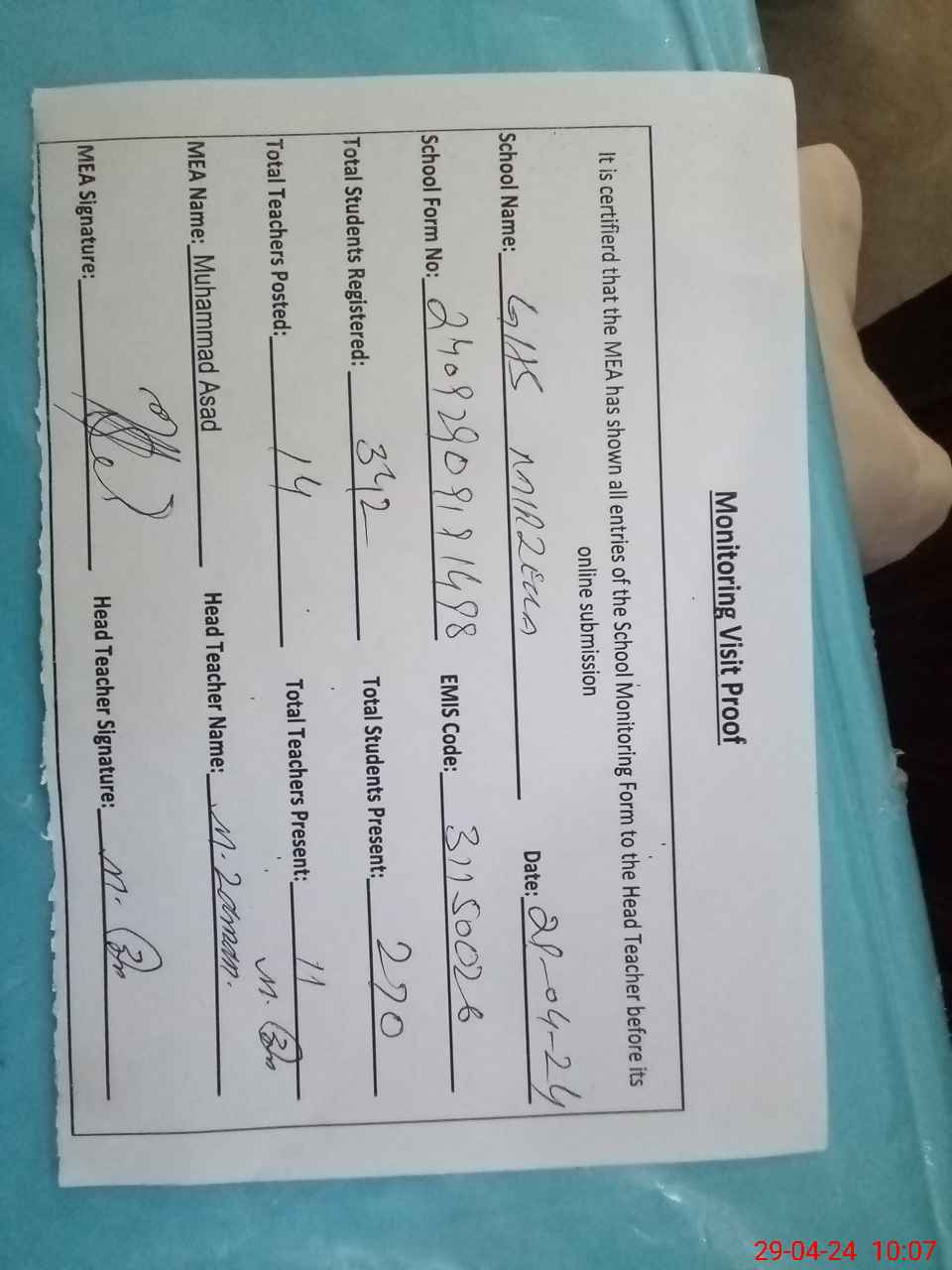 | Certified that this School was Inspected by the Undersigned MEA/DMO Today and the Information Stated Above is as Per Record. | |||||