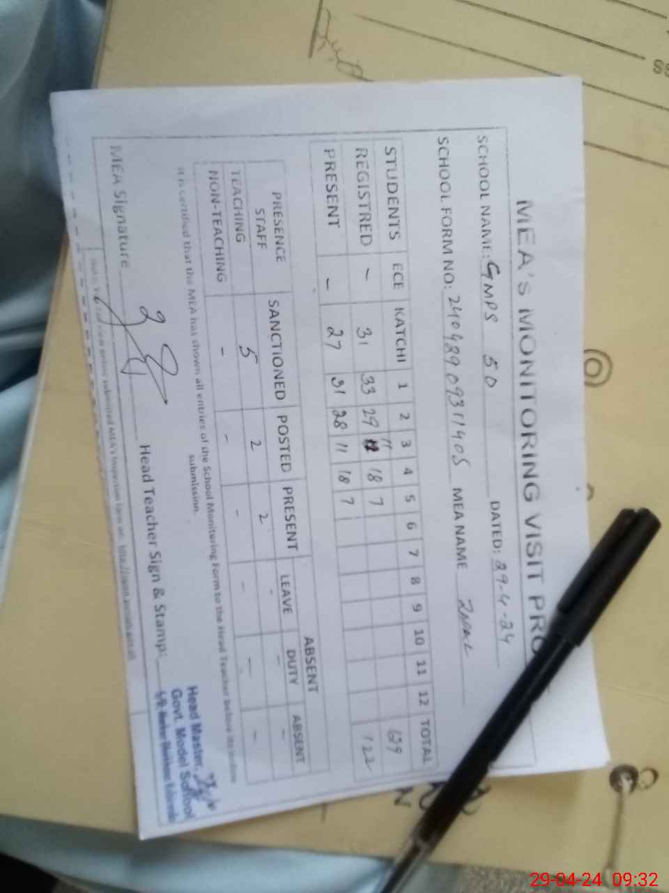 | Attendance Register | Head Teacher | MEA with School | Visit Proof |