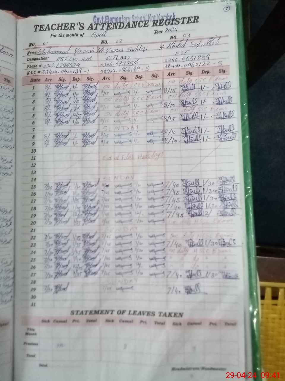 | Name: Kh**** Ha**** Designation: (School Headmaster's/Headmistress's) EST I/C HEADMASTER Phone/Cell Number: 03**** |