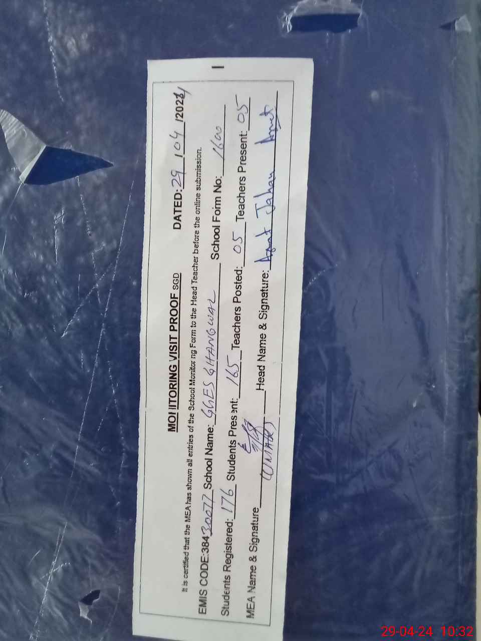 | Attendance Register | Head Teacher | MEA with School | Visit Proof |